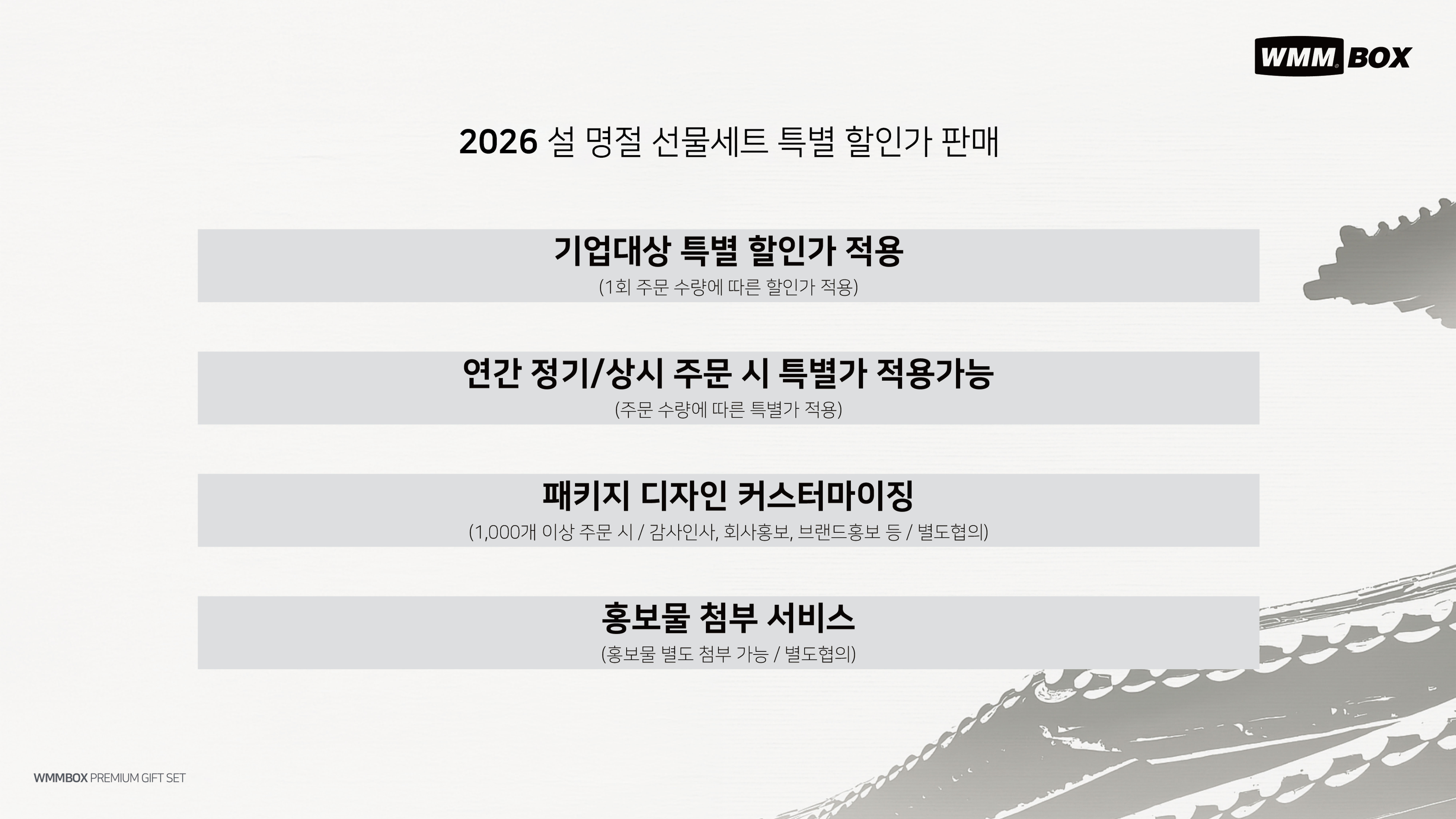 홍보물 첨부: 원하시는 홍보물을 선물세트에 함께 동봉해 드리는 서비스를 이용할 수 있습니다. (별도 협의)