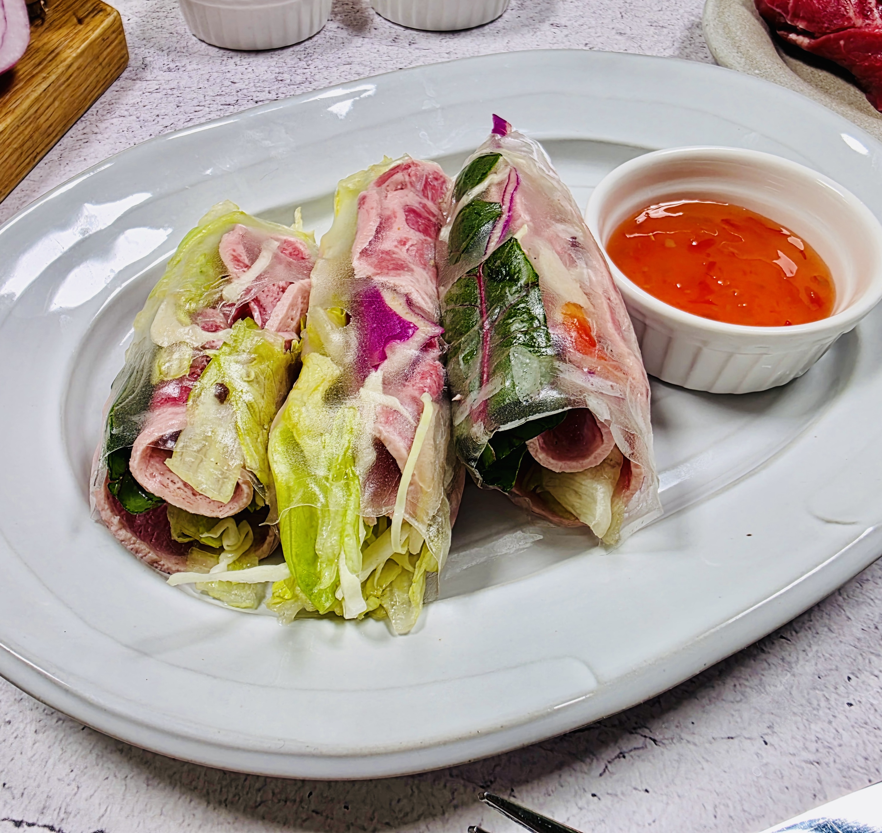 5. 완성하기 먹기 좋게 완성된 롤을 접시에 담고 땅콩 소스나 칠리소스를 곁들여 맛있게 즐깁니다.